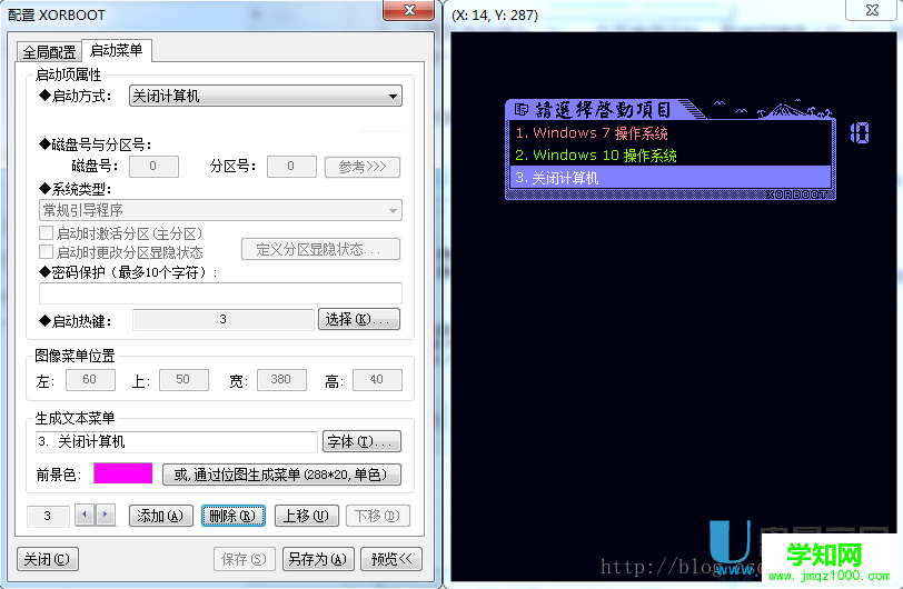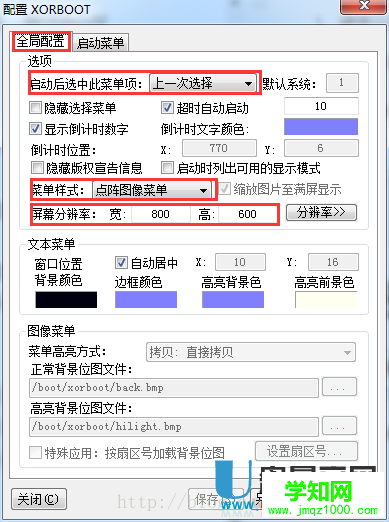 6、新建配置,進入全局配置:根據自己的需要,進行全局配置,設置XORBOOT在多系統引導啟動時的界面相關的參數。主要是設置菜單樣式及屏幕分辨率。這里以 點陣圖像菜單 為例進行演示: