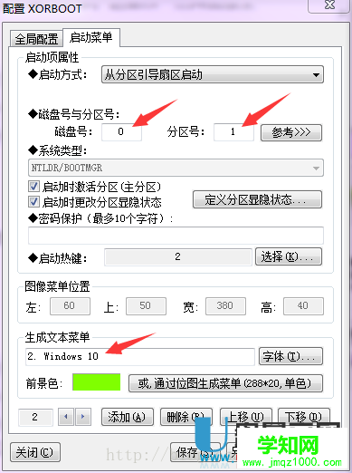 (3)、設置引導分區為:Win10(D盤)所在的:0磁盤、1分區。