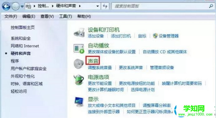1、首先打開Win7的“控制面板”→“硬件和聲音”,如圖所示。
