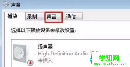 3、然后在彈出的窗口中,切換到 “聲音”選項,之后在聲音設置界面中找到開機默認的聲音文件“Windows默認”,然后再點擊下方“程序事件” 中的“Windows登錄”,默認的Win7開機聲音就是這個,如圖所示。