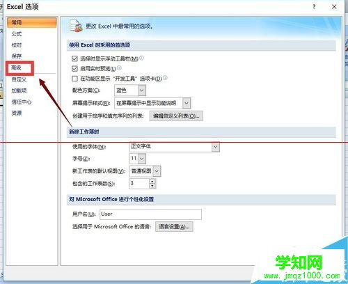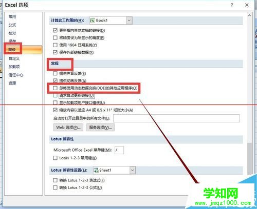 6、在高級選項右側列表中下拉,找到常規,把“忽略使用動態數據交換(DDE)的其它html' target='_blank'>應用程序”前面的勾去掉,然后點擊“確定”按鈕,重新啟動excel程序即可!如下圖所示