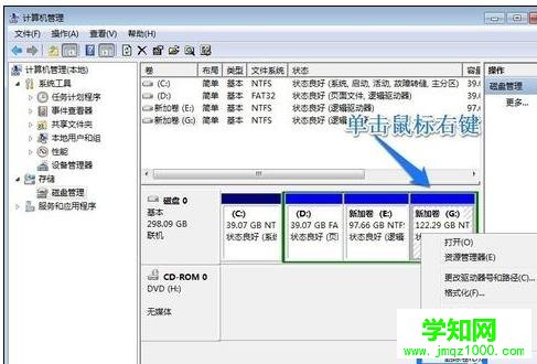 我們現(xiàn)在先把擴(kuò)展分區(qū)一次刪除,我們在G盤上單擊鼠標(biāo)右鍵,然后在菜單中點擊刪除卷!