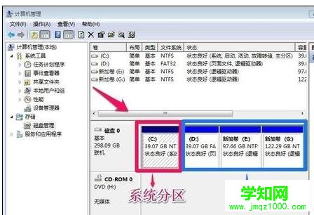 在磁盤管理窗口中,大家可以看到小編的硬盤分為了4個分區(qū)。小編在這里給大家科普一下,紅色的C盤是我們的主分區(qū),其它的D,E,G盤都是我們的擴(kuò)展分區(qū),主分區(qū)通常放我們的操作系統(tǒng),也就是我們的系統(tǒng)盤。擴(kuò)展分區(qū)我們通常用來存放數(shù)據(jù)!硬盤為什么要分區(qū)呢?舉個簡單例子,比如你買了個房子一般不會只有一個家吧,你是不是也要把他分為客廳,廚房,餐廳,書房等等!好了,今天我們的操作都是在擴(kuò)展分區(qū)上進(jìn)行操作!小編這里把D盤,E盤,G盤重新進(jìn)行分區(qū)!