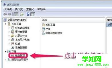 在計算機(jī)管理窗口中,我們單擊存儲中的磁盤管理打開!