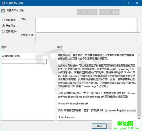 示例:若要指定只隱藏“藍牙”頁面(其URI為ms-settings:bluetooth):