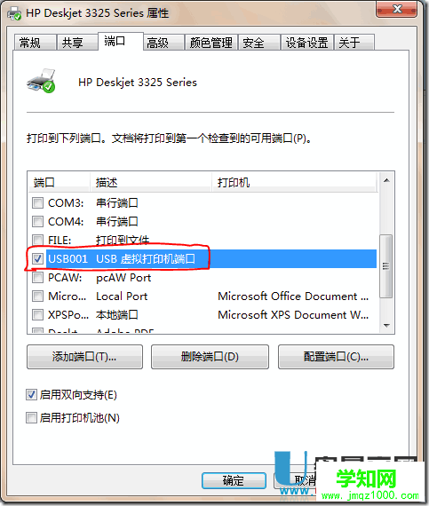 13、切換到 端口 選項卡,選中 USB001 USB虛擬打印機端口 后點擊應用。