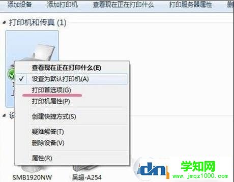 1、首先,打開”設備和打印機“,右鍵點擊HP打印機,選擇“打印首選項”。
