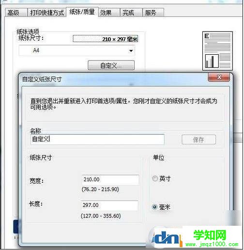 3、如果不能打印,那么可以嘗試修改左方的”紙張大小“為合適的大小,或者點擊”自定義“手動指定大小,試試能否打印。
