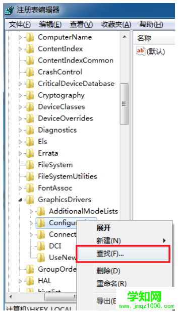 2、依次展開HEKY_LOCAL_MACHINE SYSTEM ControlSet001 Control GraphicsDrevers configuration,在configuration上右擊選擇【查找】,輸入【scaling】,點擊【查找下一個】。