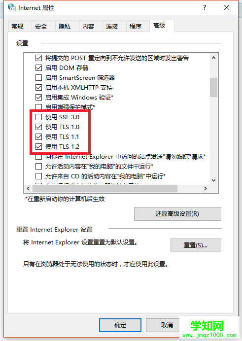 直接進入“控制面板-Internet選項”,找到“高級”選項卡,咱們一項一項的往下翻,看到沒有,IE竟然還在使用把TLS 1.0、TLS 1.1、TLS 1.2這些網絡通信加密技術,而支持https的SSL 3.0沒有勾選,大家知道怎么做了吧?把TLS去掉,選擇SSL 3.0,重啟瀏覽器就能感受到立竿見影的變化了!