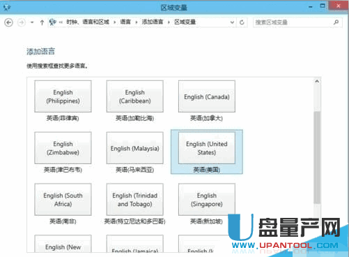 在添加語(yǔ)言設(shè)置里選擇 英語(yǔ) ,并點(diǎn)擊 打開(kāi) 按鈕,在 區(qū)域變量 設(shè)置頁(yè)面里選擇 英語(yǔ)(美國(guó)) ,并點(diǎn)擊 添加 按鈕