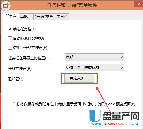 在任務(wù)欄和開(kāi)始菜單屬性窗口中點(diǎn)擊自定義按鈕