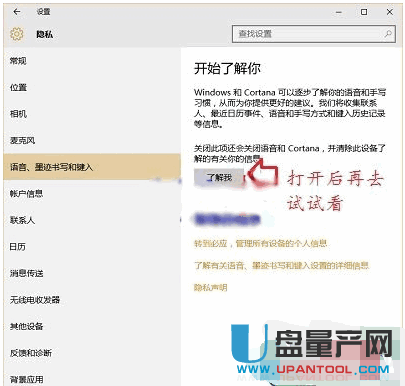 在隱私窗口,點(diǎn)擊左側(cè) 語(yǔ)言、墨跡書(shū)寫(xiě)和鍵入 項(xiàng)目,在右側(cè)窗口點(diǎn)擊 了解我 打開(kāi)小娜,微軟輸入法個(gè)性化就能設(shè)置了。