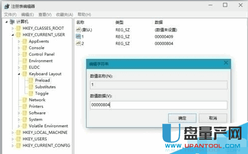 在HKEY_CURRENT_USERKeyboard LayoutPreload,修改 1 的鍵值為 00000804