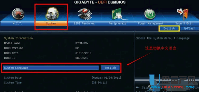 進(jìn)入BIOS界面后首先切換語(yǔ)言,來(lái)更方便直觀的進(jìn)行下一部操作