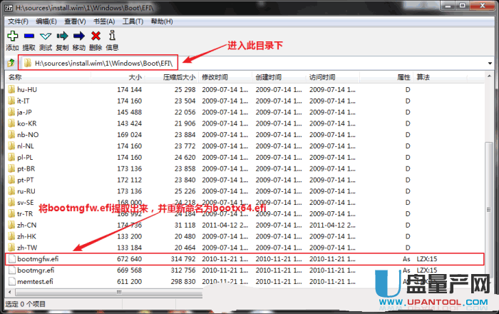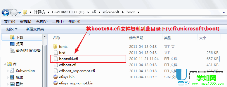然后在U盤里找到efiMicrosoft這個目錄,把剛改名的bootx64.efi也放進這個boot文件夾,如圖所示:
