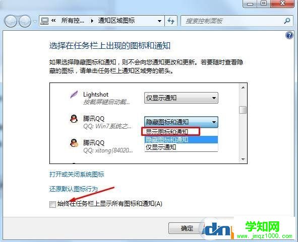 3、找到QQ,然后設(shè)置為顯示圖標和通知,如果想把所有圖標都顯示出來,那么勾選,始終在任務(wù)欄上顯示所有圖標和通知即可。