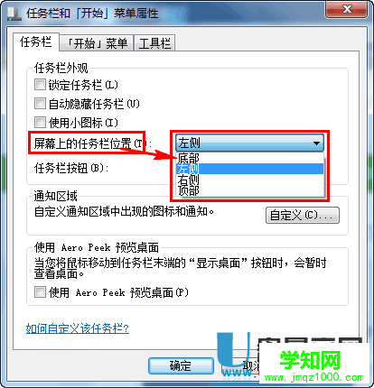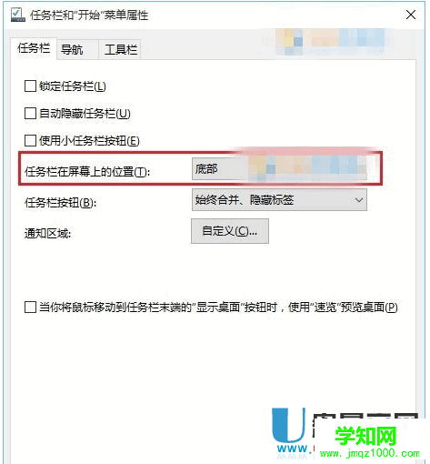 然后在新出現的窗口里,去掉鎖定任務欄前面的勾,然后在 任務欄在屏幕上的位置選項,選擇底部。