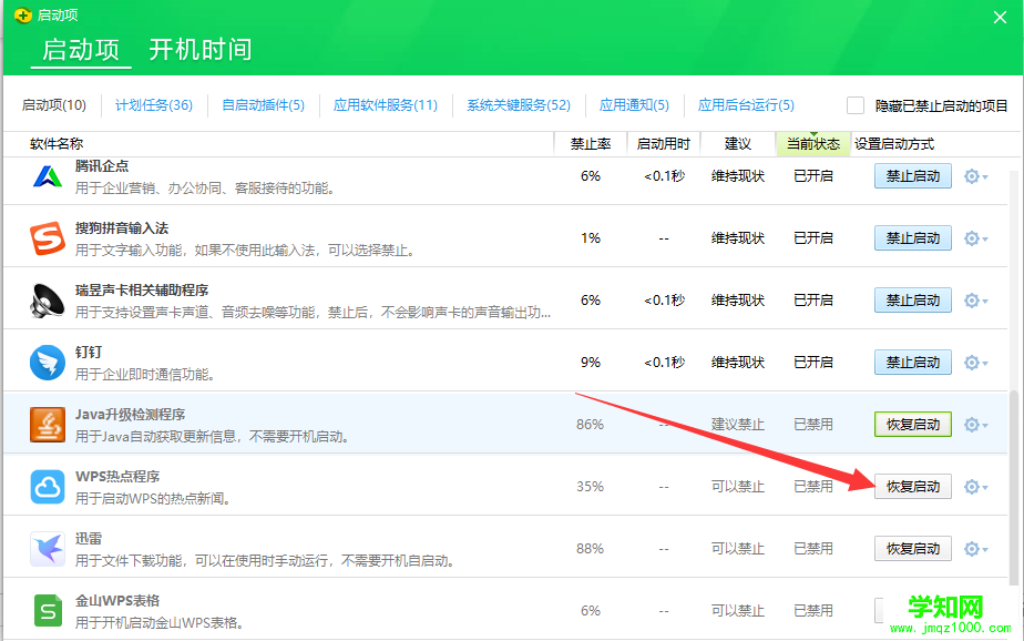 3、也可以找到想要開機(jī)啟動(dòng)的進(jìn)程,點(diǎn)擊恢復(fù)啟動(dòng)