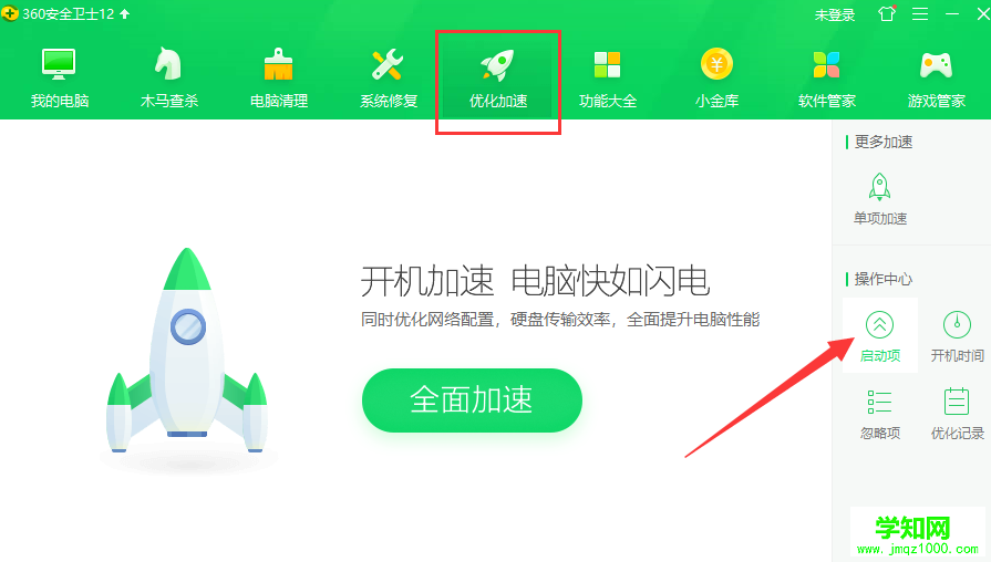 1、我們可以使用常用的360安全衛(wèi)士,打開后選擇優(yōu)化加速,點(diǎn)擊啟動(dòng)項(xiàng)