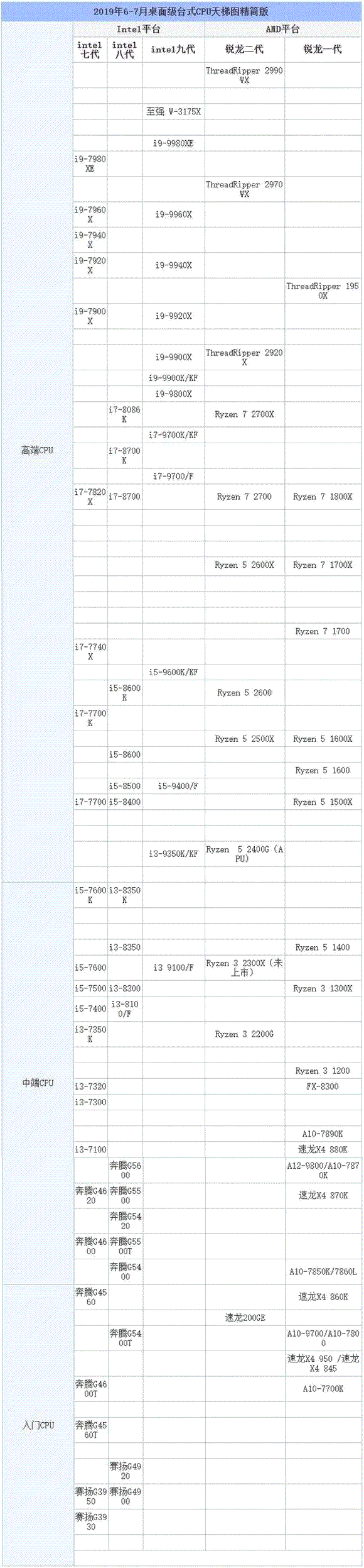 天梯,原意是登天的階梯,后被引申用于積分系統(tǒng)或排名系統(tǒng)之意。現(xiàn)在提到天梯,更多的是對(duì)顯卡和處理器的性能排名。CPU天梯圖是為了讓裝機(jī)用戶(hù)更加方便的選擇適合自己的處理器,CPU性能高低一目了然,更快的了解自己選擇的處理器屬于哪一個(gè)級(jí)別。下面組裝電腦小編給大家分享一下最新cpu天梯圖,CPU天梯圖中共有兩個(gè)平臺(tái),即intel和AMD平臺(tái),本版更新了Ryzen5/7,APU新品,嘗試重排4590S到2400S區(qū)段,酷睿9系家族,奔騰5系,Ryzen新型號(hào)。