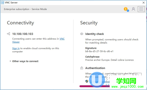 然后進入主界面,可以看到左邊 Connectivity 板塊為連接相關的信息,顯示目前的服務器端IP為10.100.100.103,你的不一定是這個ip,但需要記住此ip;右邊為 Security 為安全相關信息,上邊 Identity check 為一些身份檢查等信息,下方 Authentication 為認證信息。