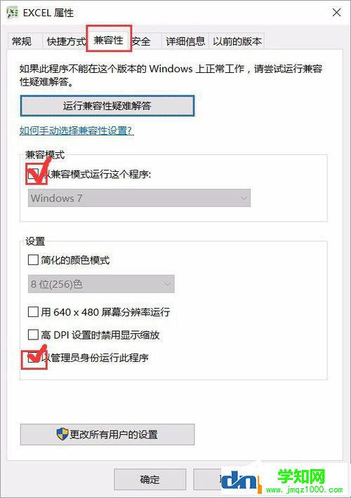 2、選擇兼容模式那個欄目,勾選兼容模式,以管理員身份運行此程序,然后確定;