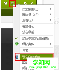 1、其實很多軟件都擁有自動關機功能,比如QQ音樂,點擊皮膚旁邊的小菜單,選擇設定自動關機
