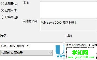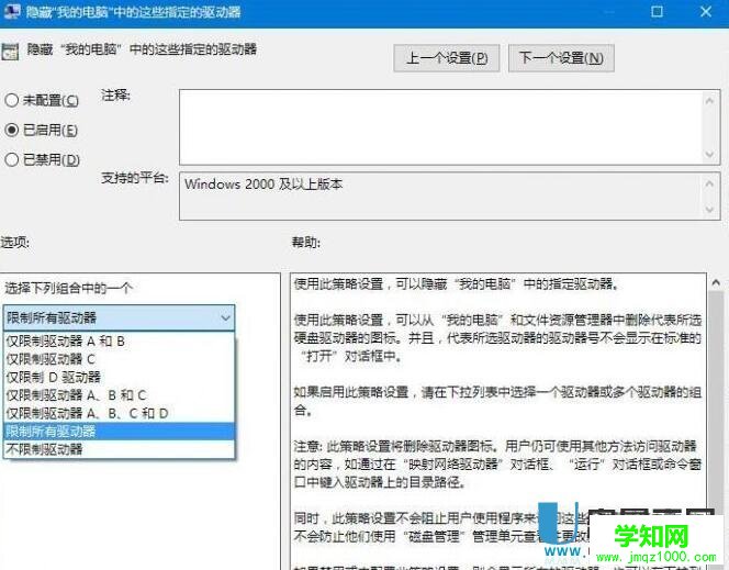3、在右側窗口里就會發現有一個隱藏 我的電腦 中的這些指定的驅動器的策略,雙擊它進去,就可以設置了,設置界面如下,選中已啟用,然后在選擇下列組合中的一個里,改成只限制G驅動器,意思就是隱藏G盤然后點擊確定就行。