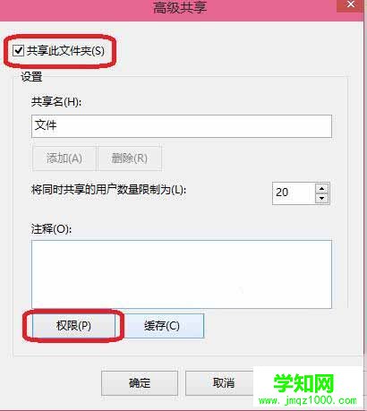 4、打勾 共享此文件夾 ,在單擊 權限 。如圖所示: