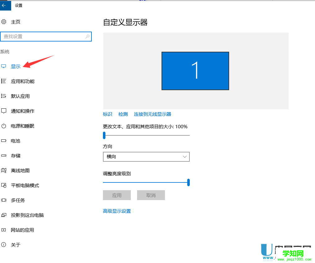 3、然后在設置里,找到顯示選項,點擊它。然后就會發現右邊有一個更改文本、應用、和其他項目的大小,這里確保是100%