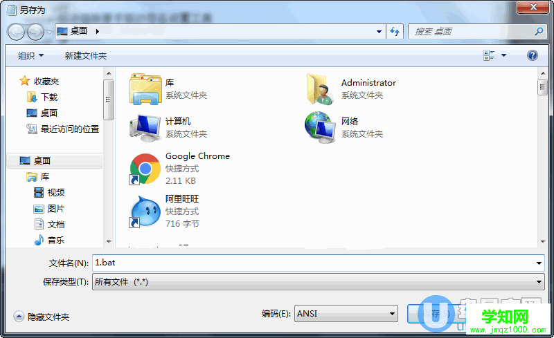 保存的時(shí)候記得選一下所有文件,這樣才不會(huì)被保存為txt,如下圖,把bat后綴加上。