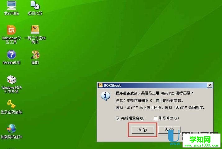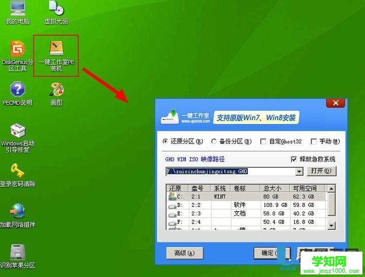 5、接著進(jìn)入到WindowsPE中,開(kāi)始恢復(fù)系統(tǒng),如圖。點(diǎn)擊PE裝機(jī),點(diǎn)擊 確定 (因?yàn)檐浖?huì)自動(dòng)識(shí)別ghost映像文件路徑,所以無(wú)需你再怎么選擇操作)。