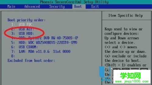 2、在故障電腦上插入已制作好的U盤(pán)。按電源鍵打開(kāi)系統(tǒng)故障電腦,彈出屏幕后底下有一行英文提示,按提示操作,一般是按F2鍵進(jìn)入bios界面。然后按鍵盤(pán)中的上下左右鍵中的左右鍵,接著按上下鍵選中 boot中的3: USB HDD (選中以后,這行字會(huì)變?yōu)榘咨模兂砂咨煮w后,按F10(下方有提示F10 Save and Exit),接著按Y(yes)就保存了設(shè)置。