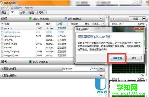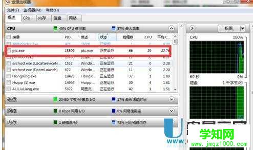 在資源監視器選項卡下我們可以看到很直觀地觀察到哪個軟件最占CPU,大多數軟件的CPU使用率都在波動,于是就有了CPU使用率的波動。如果有一兩個CPU使用率一直居高不下或者跳動幅度大,我們就需要關閉它。