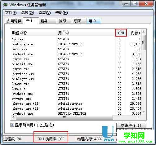 首先我們打開任務管理器,然后切換到cpu行列,對占用cpu的出程序逐一排查,查看哪個cpu程序占用的cpu忽高忽低的情況。找到占用cpu不穩定的進程將其結束掉(不是系統進程的前提下),如果發現時系統進程不能結束的話,那就系統的問題了。
