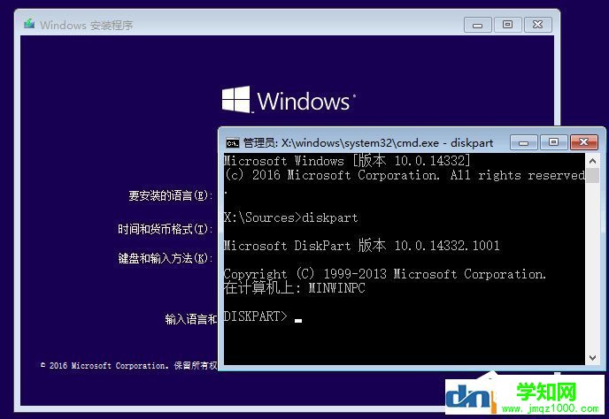 4、按Shift + F10組合鍵打開html' target='_blank'>命令提示符窗口(有些筆記本可能需要同時按住Fn鍵)。輸入diskpart命令后回車即可打開Microsoft DiskPart分區工具。