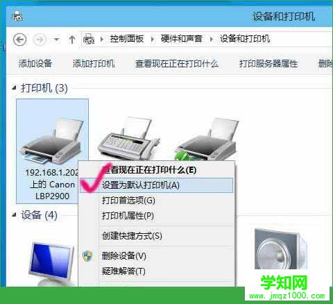 6、右鍵要指定默認打印機的設備,選擇 設定為默認打印機 。如圖所示: