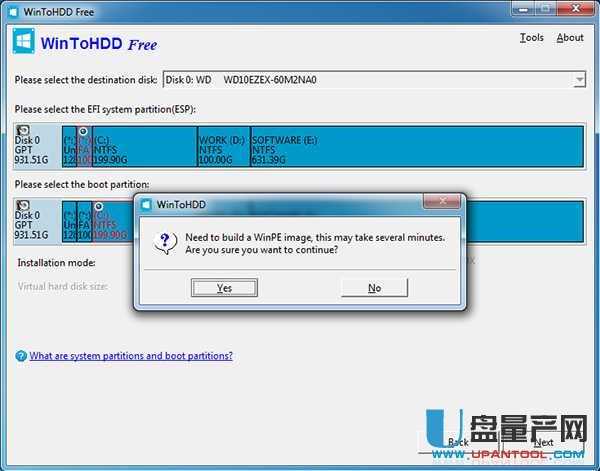 7、確保盤符無誤后,點擊 Next 下一步,WinToHDD 會提示你將會花費一些時間來下載并建立一個 WinPE 環境,這個 WinPE 將用來為你安裝新的 Windows 系統,選擇 Yes 繼續。