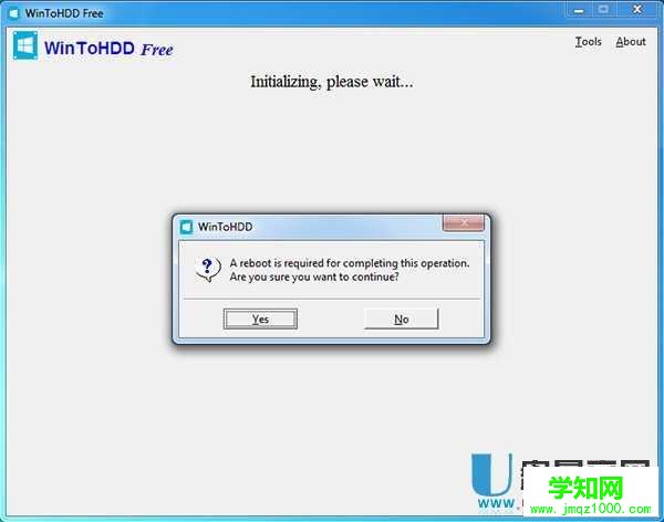 8、待 WinPE 成功建立之后,WinToHDD 就會提示你是否重啟電腦了,選擇 Yes 重啟電腦進入 WinPE 環境,即可開始重裝系統。