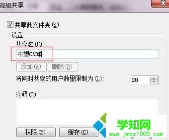 3、勾選“共享此文件夾”—>輸入“共享名稱”(關鍵的地方,請注意),在共享名稱后加個$符號,然后點擊“確定”即可。