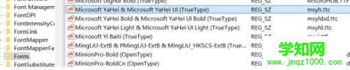 3、接下來我們開始修改字體,在右側(cè)雙擊“Microsoft YaHei & Microsoft YaHei UI (TrueType)”項(xiàng),把該項(xiàng)的值,改成默認(rèn)的“msyh.ttc” ;