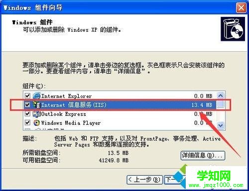 4、在彈出的“windows組件向導”窗口,我們勾選“Internet信息服務(IIS)”,單擊“下一步”;