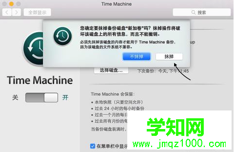 6、要使用移動(dòng)硬盤(pán)來(lái)作 Time Machine 備份的話(huà),系統(tǒng)會(huì)刪除上硬盤(pán)上的所有數(shù)據(jù)。點(diǎn)擊 抹掉 按鈕繼續(xù)。