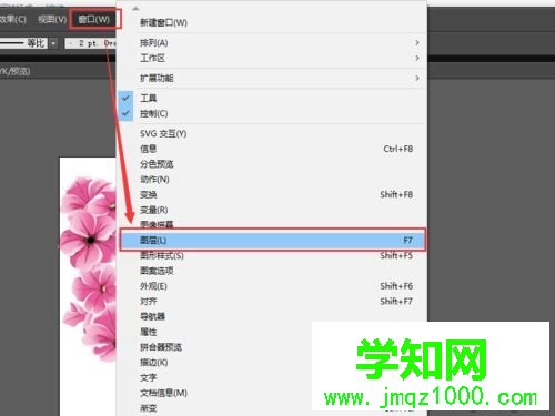 2、在軟件AI菜單欄中,點擊“窗口”—“圖層”,或者使用快捷鍵F7,打開圖層面板;