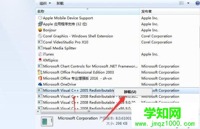 5、到卸載面板后找到vc++軟件,用鼠標(biāo)右鍵點(diǎn)擊選擇。在出現(xiàn)的卸載選項(xiàng)直接點(diǎn)擊卸載把程序卸載掉就可以了安裝了。如圖: 等待vc++程序安裝好之后再安裝軟件就正常了。