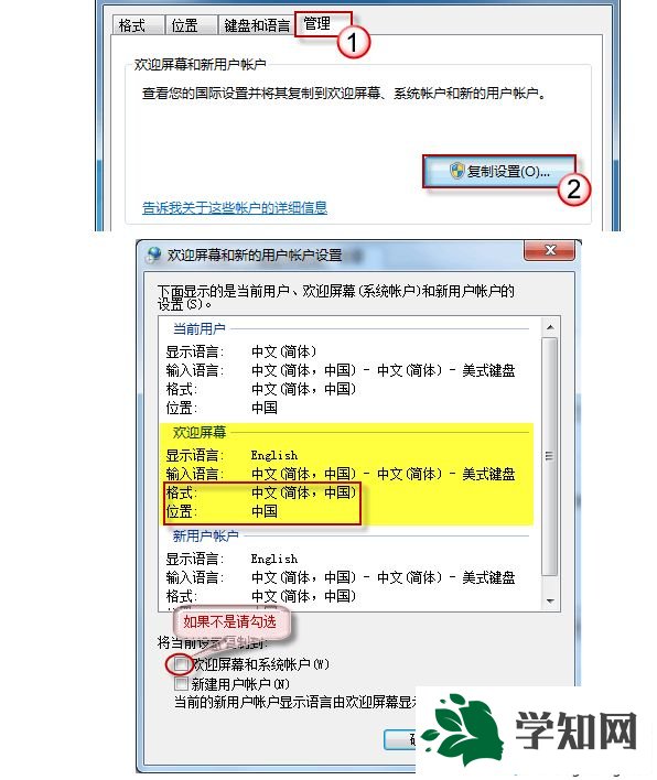 打開“開始-〉控制面板-〉時鐘、語言和區域-〉區域和語言”在“格式”頁,確認“格式欄”所選項為: 中文(簡體, 中國)切換至“位置”頁,確認“當前位置”為: 中國再切換至“管理”頁,點擊“復制設置”按鈕。查看一下“歡迎屏幕”的格式是否是: “中文(簡體 中國)”,“位置”是否是“中國”。如果不是,請勾選復選框: 將當前設置復制到“歡迎屏幕和系統賬戶”,并按“確定”保存應用。然后重啟