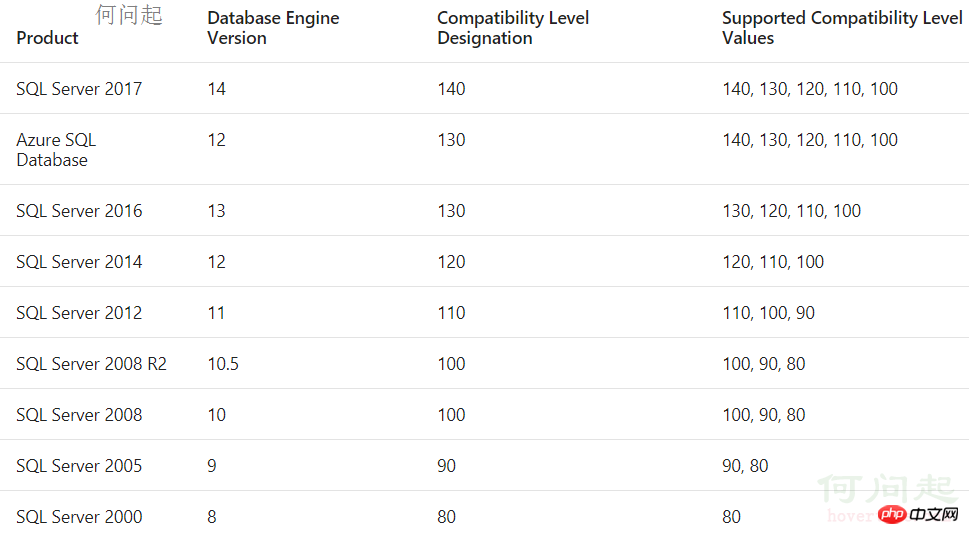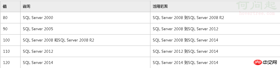 Sql Server 7.0使用70級別,Sql Server 2000使用80級別,Sql Server 2005使用90級別,Sql Server 2008使用100級別,Sql Server 2012使用110級別。如下表: