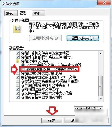 然后再點“查看”這一欄,然后取消“隱藏受保護的操作系統文件”前的對勾,再選中“隱藏文件和文件夾”,然后“顯示所有文件和文件夾”最后點確定即可。