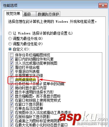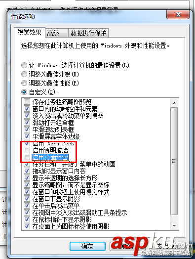 這里可以關閉啟動透明玻璃和啟用桌面組合這兩個效果,或者先關閉啟動透明玻璃試試還有沒有問題,如果還有問題再關閉啟動桌面組合,因為關閉了啟動桌面組合,啟用Aero Peek也會被同時關閉(啟用Aero Peek開啟的前提是開啟了桌面組合)